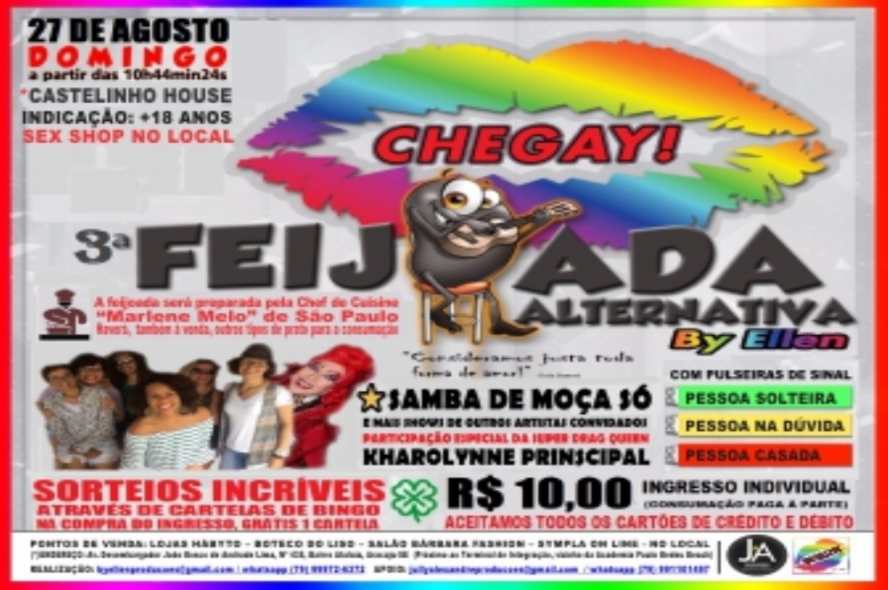 Repetindo o sucesso que foi nas edições anteriores, a 3ª FEIJOADA CHEGAY será realizada no domingo 27 de agosto, numa alusão à Parada LGBTT que acontecerá nesse mesmo dia, na Orla de Atalaia. O evento terá início em um sugestivo horário, 10h44min24s, dirigido especialmente ao público alternativo, mas aberto a todos os amantes de uma boa programação. O local será o CASTELINHO HOUSE, localizado à Av. Desembargador João Bosco, Nº 435, Bairro Atalaia, Aracaju – SE (próximo ao Terminal de Integração e vizinho à Academia Paulo Bedeu Beach).