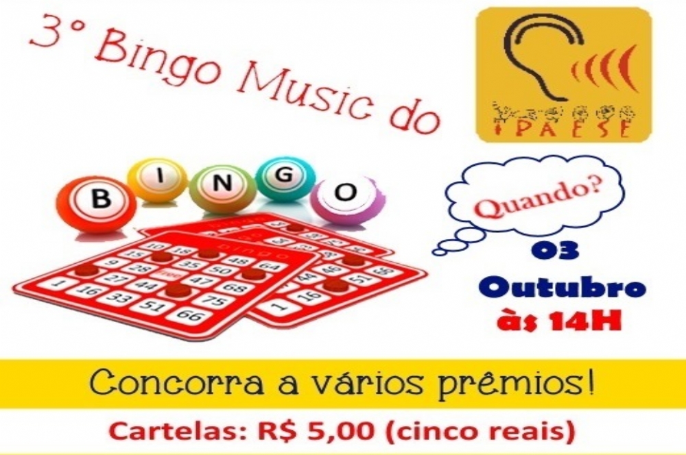 O IPAESE, instituição sem fins lucrativos, primeira escola especializada para surdos em Sergipe, realizará no dia 03 de outubro, 3º Bingo Music do Ipaese. O objetivo é arrecadar recursos financeiros em prol da nossa instituição.