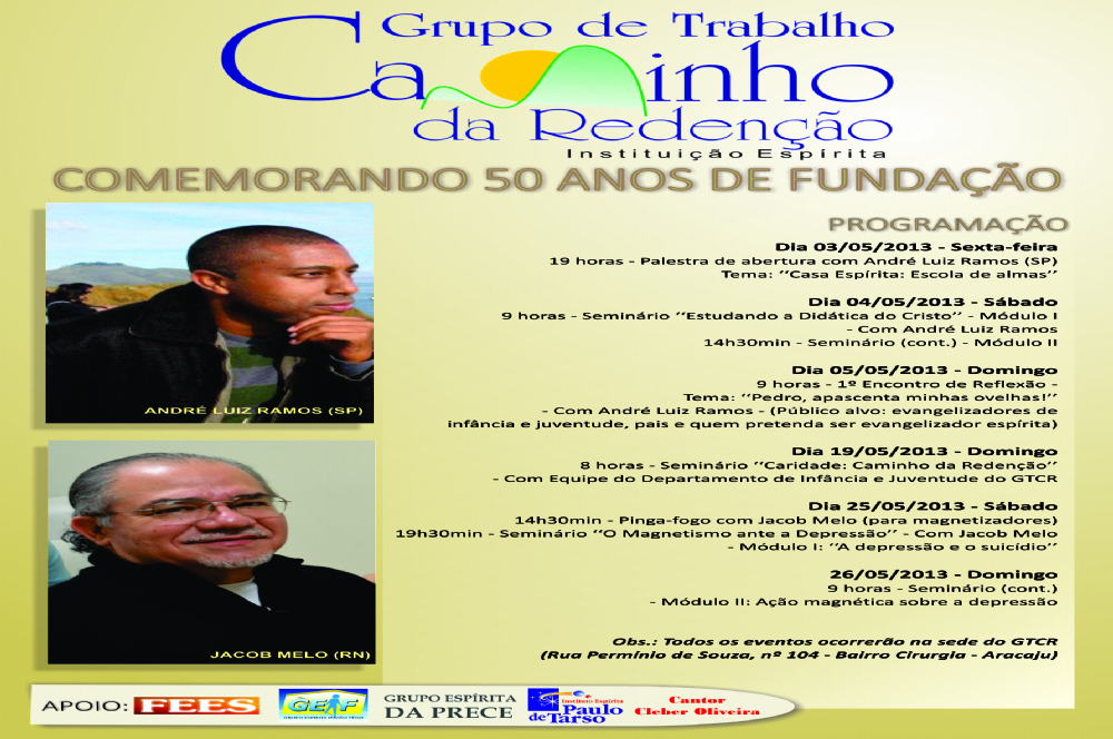 O Grupo de Trabalho Caminho da Redenção, instituição espírita cristã, comemorará seus 50 anos de fundação através de uma vasta programação nos dias 3, 4, 5 e 25 de maio. Palestras, seminários, meditação e encontros de reflexão farão parte do evento que será realizado na sede do grupo.