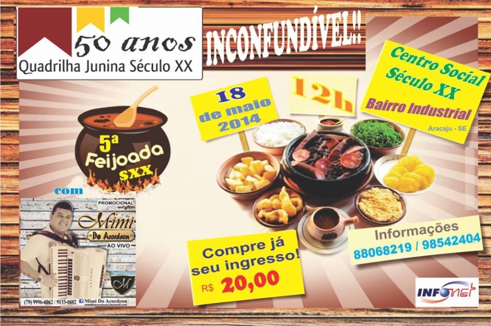 Comemorando os 50 anos de existência e com o objetivo de arrecadar valores para o desenvolvimento de suas atividades culturais para participação dos festejos juninos de 2014, a quadrilha junina Século XX, realizará neste domingo, 18, a jtradicional Feijoada.