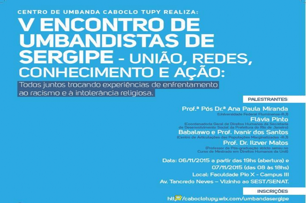 O Centro de Umbanda Caboclo Tupy promoverá, no dia 06 de novembro, às 19h, e 07 de novembro, das 8 às 18h, o 5º Encontro de Umbandistas de Sergipe. A atividade será realizada na Faculdade Pio Décimo – Campus III, localizado na Avenida Tancredo Neves, vizinho ao SEST/SENAT.