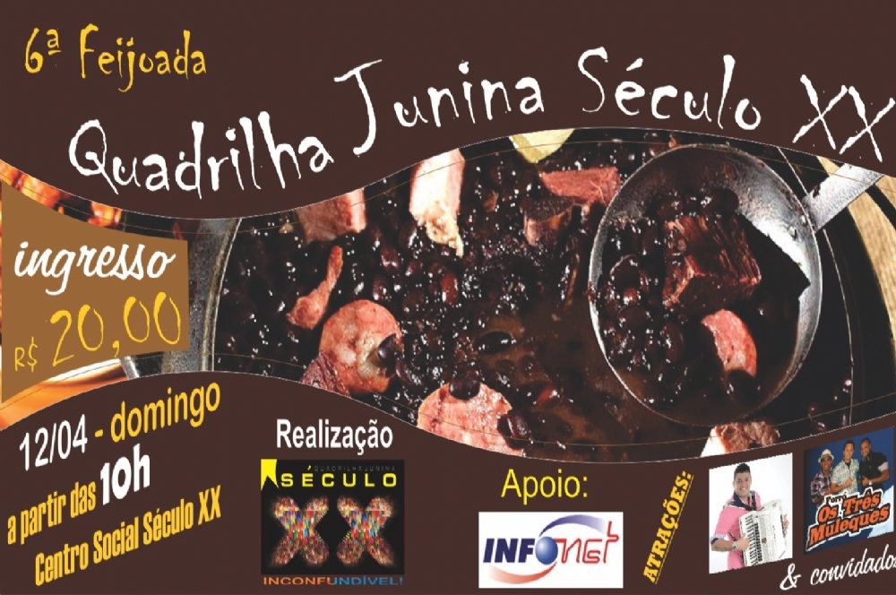 A “Feijoada da Quadrilha Século XX” completa seis anos de tradição. A edição deste ano será realizada no dia 12 de abril (domingo), a partir das 10h, no Centro Social Século XX, com a participação de vários quadrilheiros e simpatizantes do grupo.