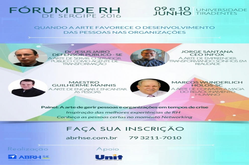 “Quando a arte favorece o desenvolvimento das pessoas nas organizações”. Este é om tema central da 9ª edição do Fórum de RH – Setor Público e Privado, que será promovido pela Associação Brasileira de Recursos Humanos, seccional Sergipe (ABRH/SE). Durante os dias 9 e 10 próximos, gestores públicos, líderes empresariais, empreendedores e representantes de vários outros segmentos interessados, poderão compartilhar experiências e acompanhar abordagens de questões e cases envolvendo o desenvolvimento e o engajamento das pessoas com os propósitos das organizações.