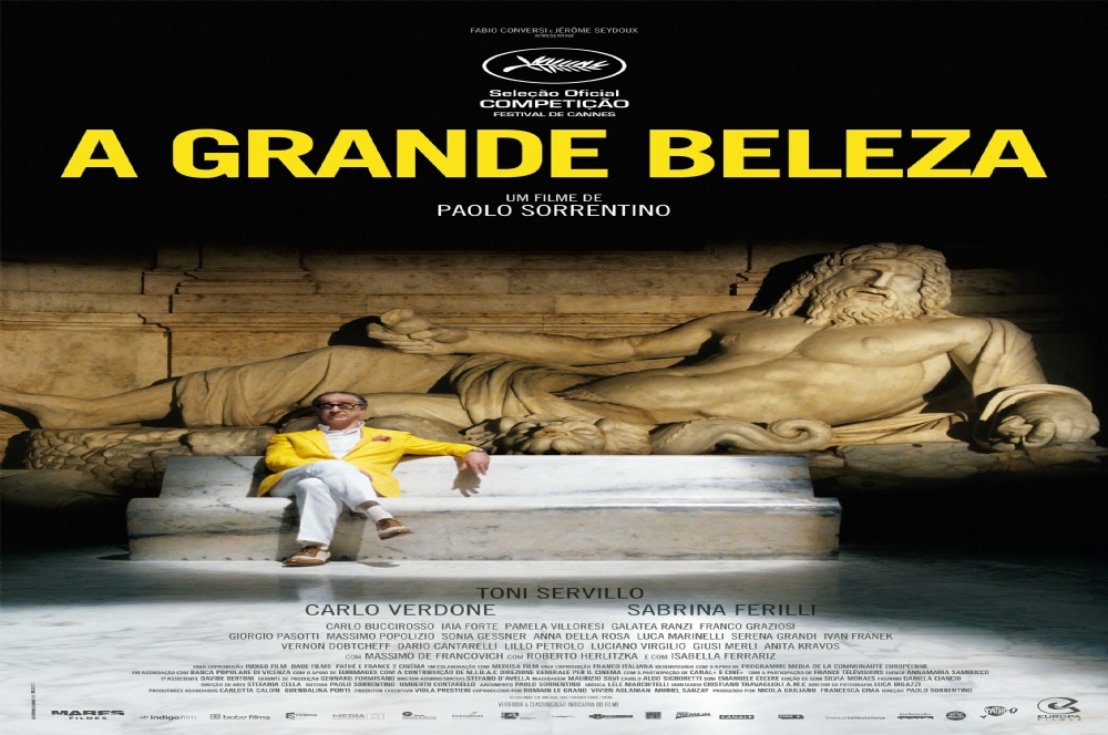(La Grande Bellezza). Itália, 2013. Direção de Paolo Sorrentino. 142m, 14 anos. Distr. no Brasil: Europa Filmes. Com Toni Servillo, Carlo Verdone, Sabrina Ferilli, Isabelle Ferrari, Vernom Dobtcheff, Giorgio Pasotti, Franco Graziosi, Sonia Gessner, Iaia Forte, Pamela Villoresi, Carlo Buccirosso, Galatea Ranz, Maassimo Popolisio, Anna Della Rosa, Luca Marinelli, Ivan Franer, Dario Cantarelli, Lillo Petrolo, Luciano Virgilio, Giusi Merli, Anita Kravos, Massimo de Frankovich.