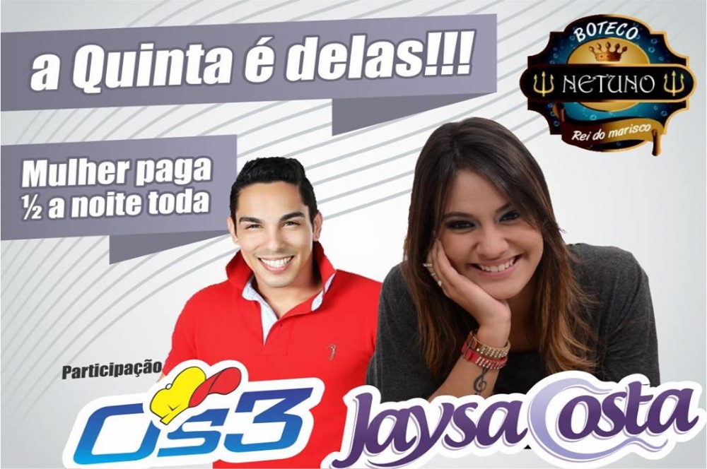A programação do fim de semana em Aracaju começa nesta quinta-feira, dia 03, com a cantora sertaneja, Jaysa Costa e com a participação da banda Os3, no Boteco do Netuno, a partir das 22h. As mulheres pagarão meia a noite inteira e os ingressos estarão sendo vendidos na bilheteria do evento durante o show.