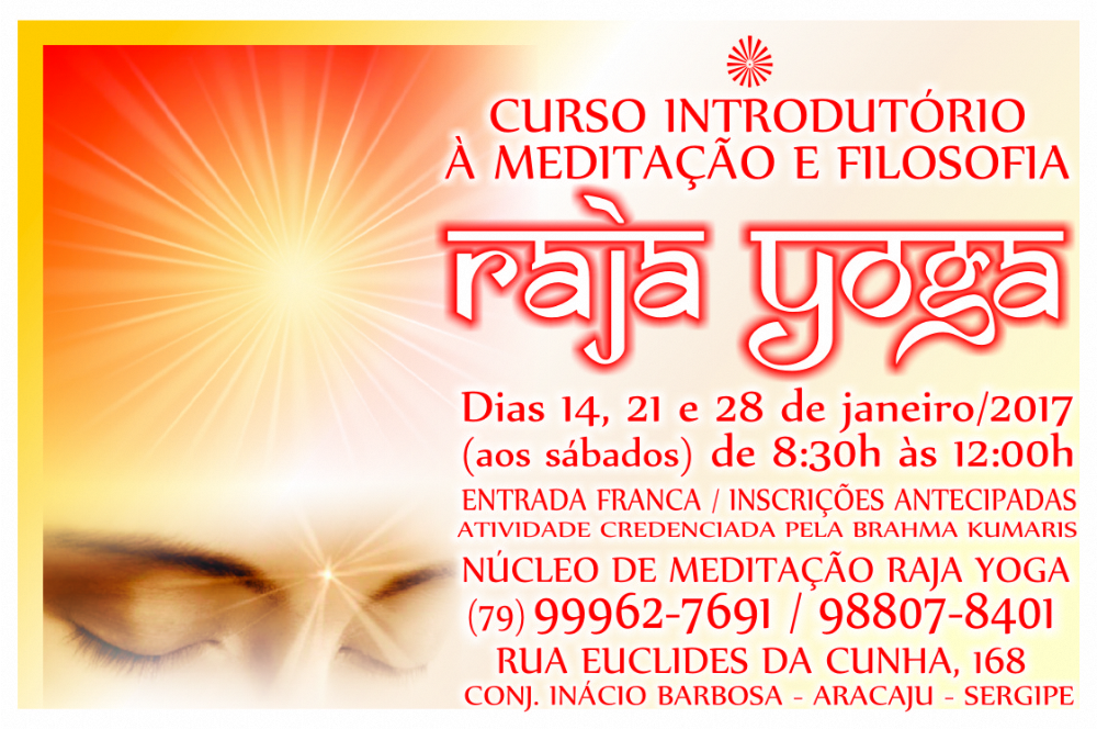 O Ponto de Serviço da Brahma Kumaris promove o curso de meditação Raja Yoga nos dias 14, 21 e 28 de janeiro. O curso acontecerá aos sábados das 8h30 às 12h, no Núcleo de Meditação Raja Yoga, na Rua Euclides da Cunha, n° 168 no conjunto Inácio Barbosa. A entrada é franca e as inscrições precisam ser feitas antecipadamente pelos telefones (79) 99962 7691 e 98807 8401.