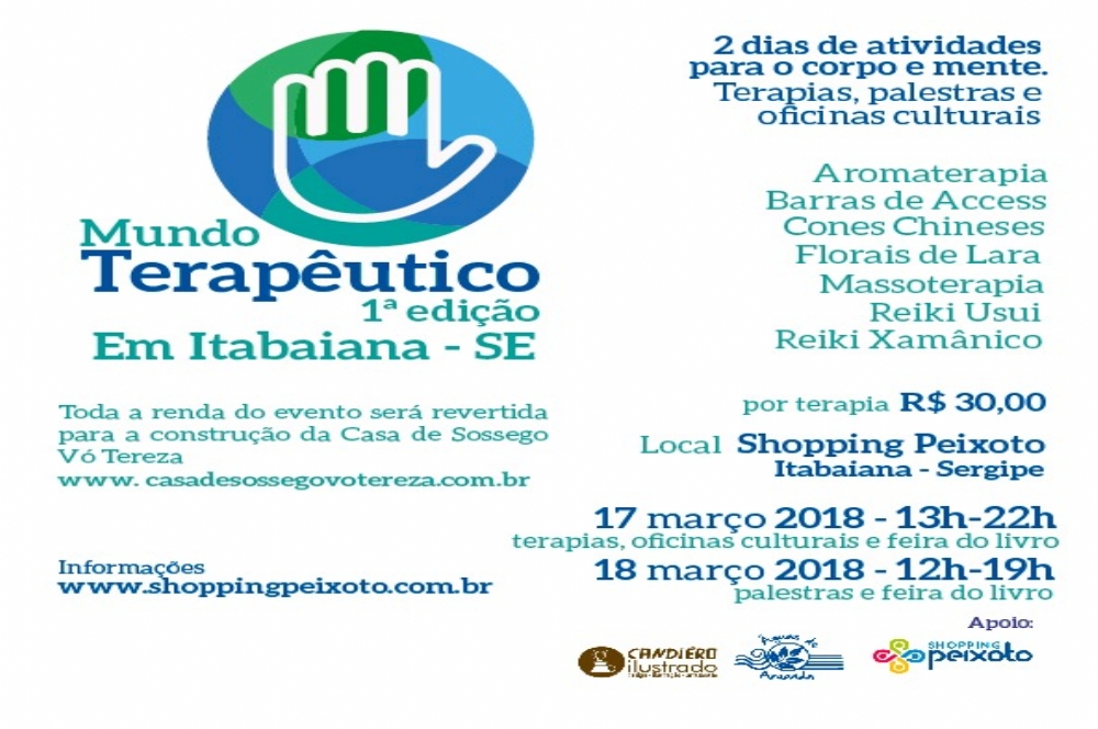 O município de Itabaiana vai receber nos dias 17 e 18 de março, no Shopping Peixoto, a primeira edição do projeto “Ação Terapêutica”. O evento já acontece regularmente na Capital Sergipana e tem como organizador o Centro de Formação Espiritual Águas de Aruanda.
