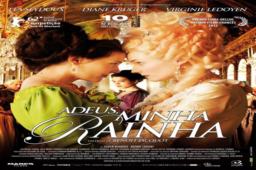 (Les Adieux a la Reine). França/Espanha, 2012. Direção de Benoit Jacquot. Roteiro de Jacquot e Gilles Taurand. Direção de Fotografia: Romain Winding. Música de Bruno Coulais. Produção de Jean Pierre Guerin, Kristina Larsen, Pedro Uriol. . 100m, 14 anos. Cia Produtora: Angoa-Agicoa Films, GMT Productions, Invest Image, Les Films Du Landemain, Morena Filmes, Palatine Etoile. Distr. no Brasil: Europa Filmes/Mares Filmes. Com Diane Kruger, Lea Seydoux, Virginie Ledoyen, Anne Benoit, Dominique Reymond, Jacques Nolot, Michel Robin, Noemie Lvovsky, Vladimir Consigny.