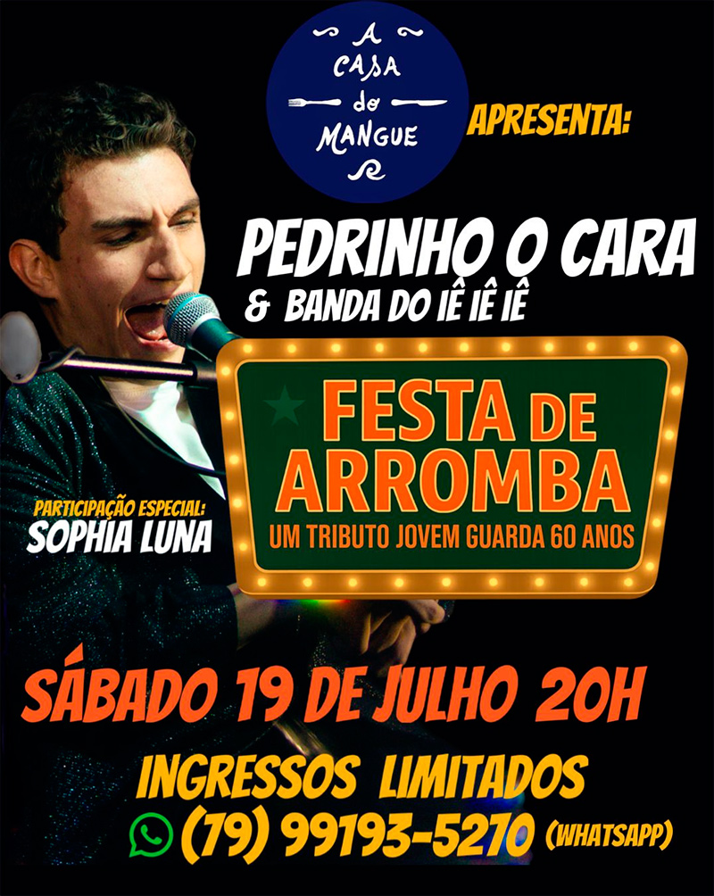 Aracaju se prepara para uma noite de pura nostalgia e celebração da música brasileira. No próximo sábado, dia 19 de julho, às 20h, a Casa do Mangue será palco do espetáculo “Festa de Arromba: Um Tributo à Jovem Guarda – 60 anos”, comandado por Pedrinho o Cara e sua vibrante Banda do Iê Iê Iê.
