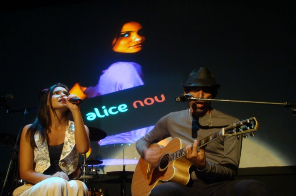 | Os shows de Alice Nou contam com convidados. Na foto com Henrique Teles da banda Maria Scombona |