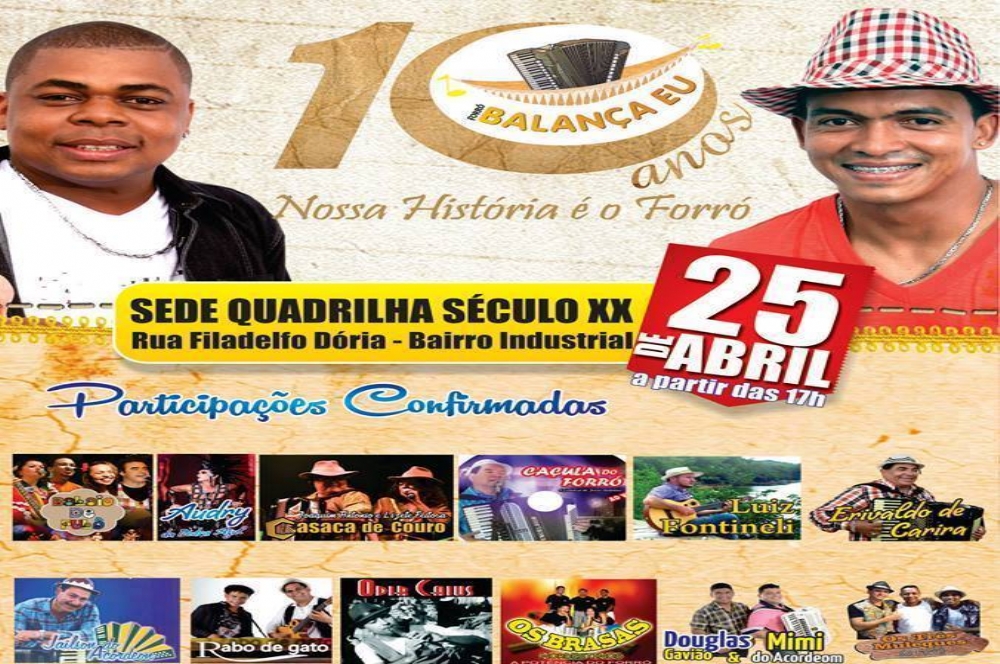 O grupo “Balança Eu” celebrará seu aniversário de 10 anos com um grande show. O evento acontecerá no dia 25 de abril com a participação de Erivaldo de Carira, Casaca de Couro, Luiz Fontineli, Balaio de Fulô e Audri da Pedra Azul.