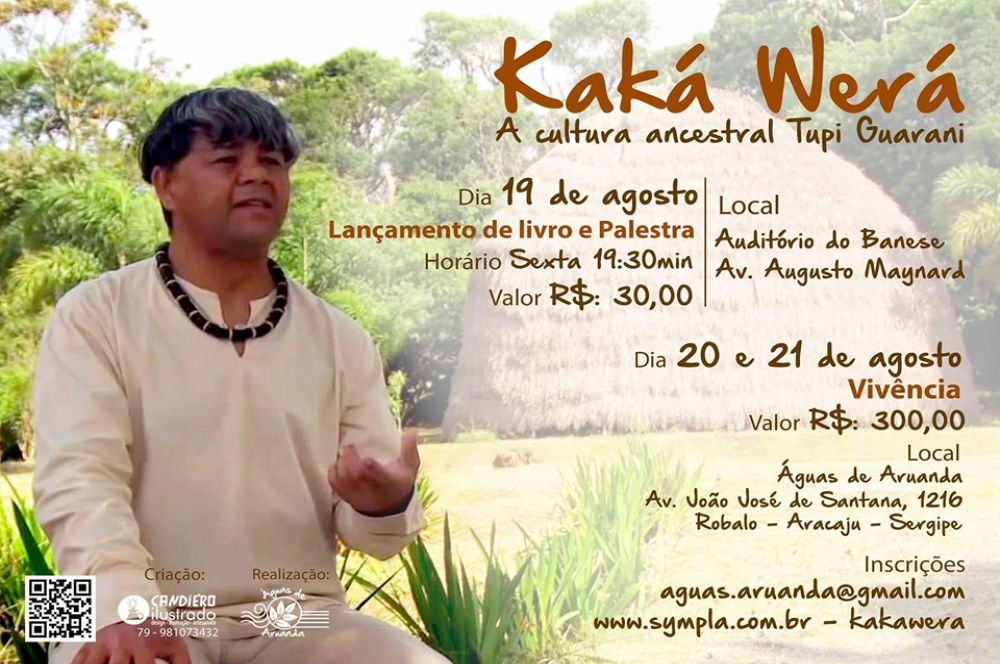 Aracaju receberá o índio Kaká Werá para uma vivência muito especial. O objetivo desta imersão é a integração de três aspectos do ser: corpo, consciência e espírito. O encontro se utiliza de exposição de conceitos, dinâmicas em grupo, partilhas e práticas contemplativas.