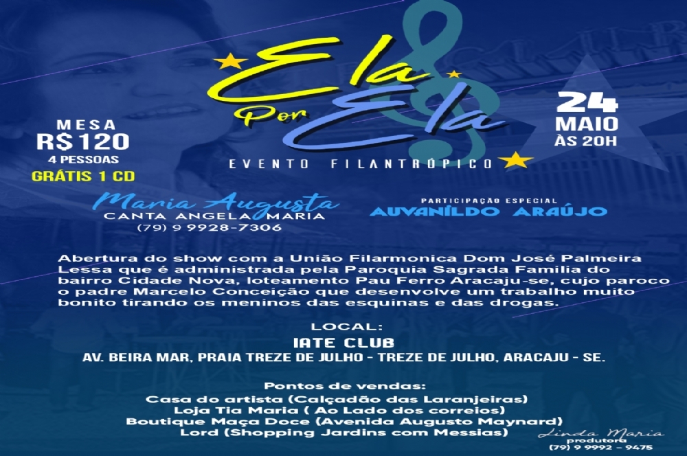 Aracaju recebe no dia 24 de maio às 20h, o show ‘Ela por Ela’ no Iate Clube de Aracaju. O evento é filantrópico e contará com a participação de Maria Augusta que canta Angela Maria. O cantor Auvaníldo Araújo também fará parte do show.