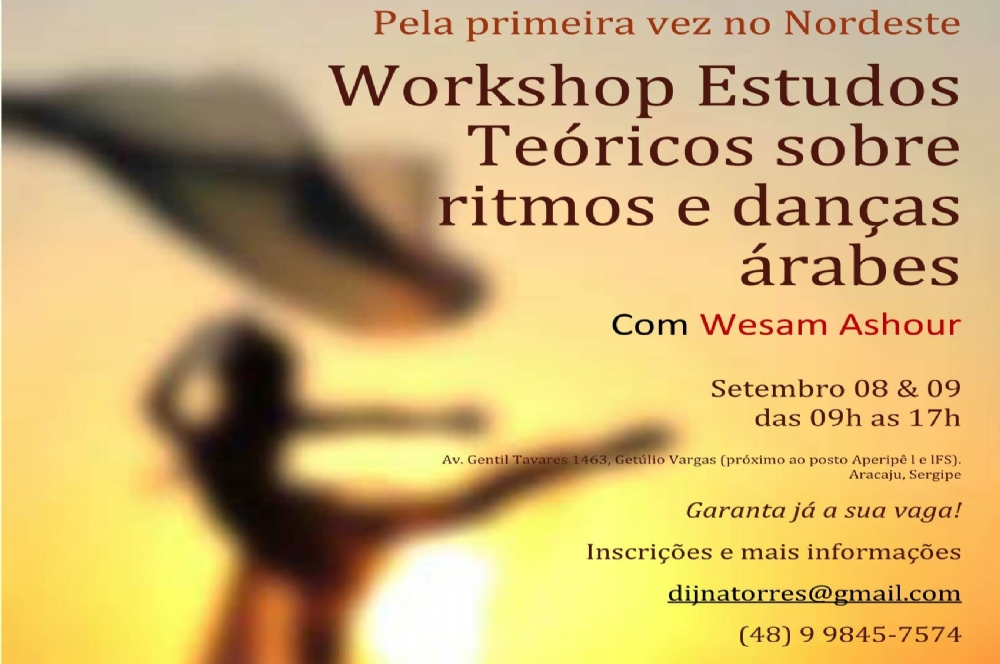 Nos dias 08 e 09 de setembro, Aracaju recebe pela primeira vez o Workshop 'Estudos teóricos sobre dança e ritmos nos países árabes e as conexões com o mundo ocidental'. Promovido e ministrado por Wesam Ashour, sírio, residente no Brasil a dois anos, o curso tem como objetivo apresentar a cultura nos países árabes, com enfoque em Síria, Líbano, Marrocos e Egito, especialmente para quem é amante da dança do ventre e seus desdobramentos, além de trazer uma aula básica sobre o idioma e os conceitos que se utilizam no universo da dança, música a ritmos árabes.
