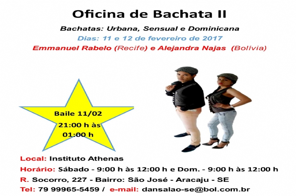 A capital sergipana receberá nos dias 11 e 12 de fevereiro a Oficina de Bachata. O evento será ministrado por Emmanuel Rabelo (Recife) e Alejandra Najas (Bolívia).