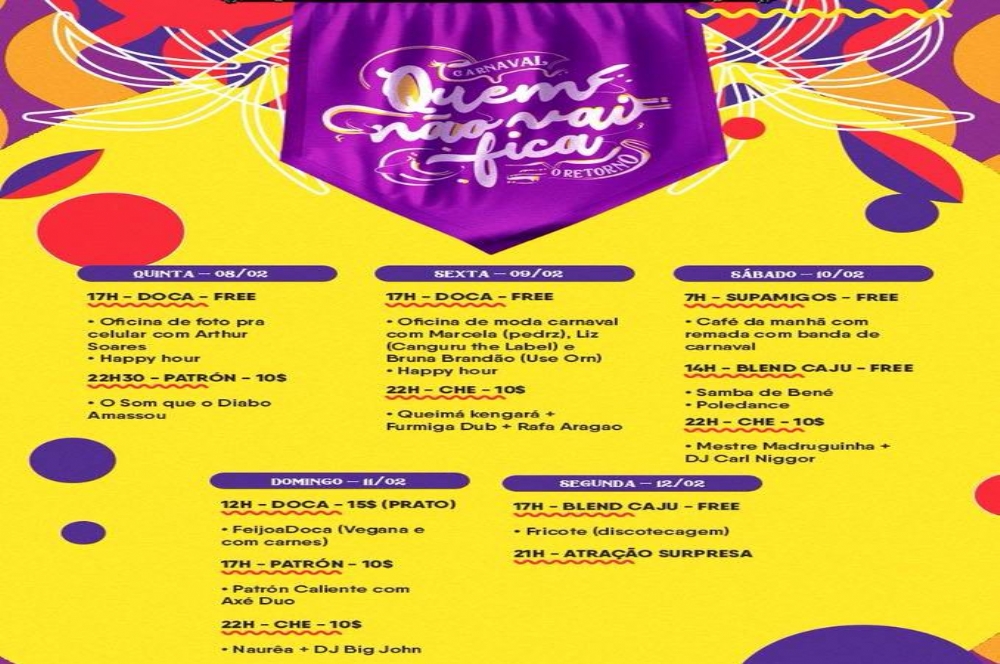 O Carnaval em Aracaju terá uma programação diferenciada. A festa ‘Quem não vai fica’ vai acontecer entre 8 e 12 de fevereiro no Doca, Patron, Che, Supamigos e Blend.