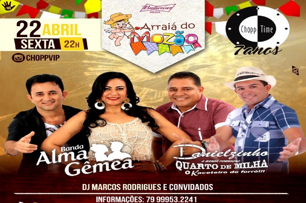 O cantor Danielzinho e Forrozão Quarto de Milha, a banda Alma Gêmea, o DJ Marcos Rodrigues e diversos convidados vão comandar o Arraiá do Mozão 2016. O arrasta-pé mais aguardado da cidade acontece dia 22 de abril, a partir das 22h, no Chopp Time, localizado na Farolândia, zona sul de Aracaju.