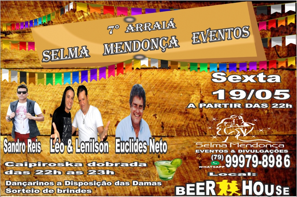 A Casa de Shows Beer House vai receber o "7º Arraiá Selma Mendonça Eventos". O evento ocorrerá no dia 19 de maio, a partir das 22h, e contará com shows de Sandro Reis, Léo e Lenilson e Euclides Neto, além de sorteio de brindes e dançarino à disposição das damas. A entrada individual custa R$ 25. A Casa de Shows e Restaurante Beer House situa-se na Orla de Atalaia, próximo ao Oceanário. Informações: (79) 9 9979-8986.