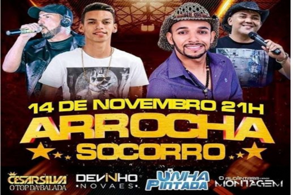 Devinho Novaes, Unha Pintada, César Silva e Banda Montagem são as atrações do Arrocha Socorro, que acontece no dia 14 de novembro, véspera de feriado.