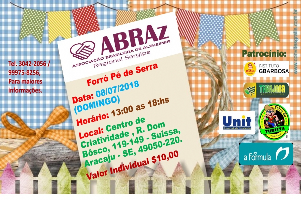 A Associação Brasileira de Alzheimer – Regional Sergipe promove neste domingo, 8, das 13h às 18h, o Arraiá da Abraz. O evento acontece no Centro de Criatividade, que fica na rua Dom Bosco, 119-149, bairro Suissa, em Aracaju. O valor do ingresso custa R$ 10. Informações podem ser obtidas por meio do telefone (79) 3042 2056 e 99975 8256.