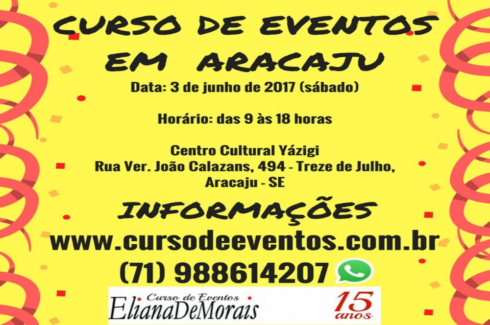 Acontece no próximo dia 3 de junho, em Aracaju, mais uma turma do Curso de organização de eventos ministrado pela produtora de eventos Eliana de Morais. As aulas acontecem no Centro Cultural Yázigi, situado na Rua Vereador João Calazans, 494, Treze de Julho.