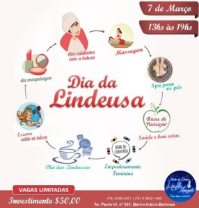 Massagem, argilaterapia, maquiagem, cuidados com nutrição, spa dos pés, cuidados com os cabelos, palestras e muito acolhimento regados a um delicioso chá da tarde, é o que promete o primeiro Dia da Lindeusa. O evento é idealizado pela professora de danças árabes Hanifah. e será realizado no próximo sábado, 7, das 13h às 19h, no Studio de danças Hayffa Manzato, localizado na avenida Paulo VI, 361, no Inácio Barbosa.