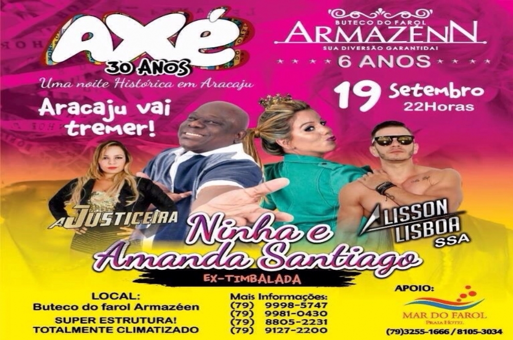 Amanda Santiago e Ninha (ex Timbalada) farão um show especial em homenagem aos 30 anos do axé music. O evento será realizado no Buteco do Farol Armazém. A noite ficará marcada na história em Aracaju e contará também com apresentações da banda A Justiceira, que será lançada no dia do evento com seu estilo "forró-sofrência" comandado pela cantora de voz marcante, Jennifer Fontes. O DJ Alisson Lysboa (SSA) também agita a festa. Ingressos antecipados disponíveis na loja Litoral 655 (Shopping Jardins), Buteco do Aramzénn (Farolândia) ou através dos contatos (79) 9998-5747 / 9981-0430. Valor de R$ 35 até sexta-feira (18).