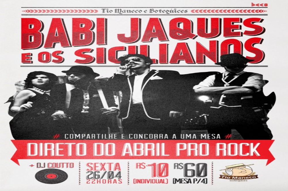 O grupo Babi Jaques & Os Sicilianos se apresentará em Aracaju no Tio Maneco Botequices, dia 26 de abril, a partir da 22 horas. A entrada custará R$ 10 (individual) e R$ 60 (mesa). Os integrantes representam um grupo de mafiosos sicilianos que vive em uma ilha fantástica situada no Rio Capibaribe, chamada Nostrife, durante uma realidade paralela que envolve a década de 50 e a contemporaneidade simultaneamente. Juntos formaram um grupo que mistura música com teatro, artes plásticas, cinema e outras esferas artísticas, com a proposta musical de criar trilhas sonoras para as letras, causando múltiplas sensações através do som. Em seu espetáculo, chamam atenção pela convergência da música com performance, indumentária, cenário, projeções e iluminação transportando o público para a realidade fantástica de Nostrife.