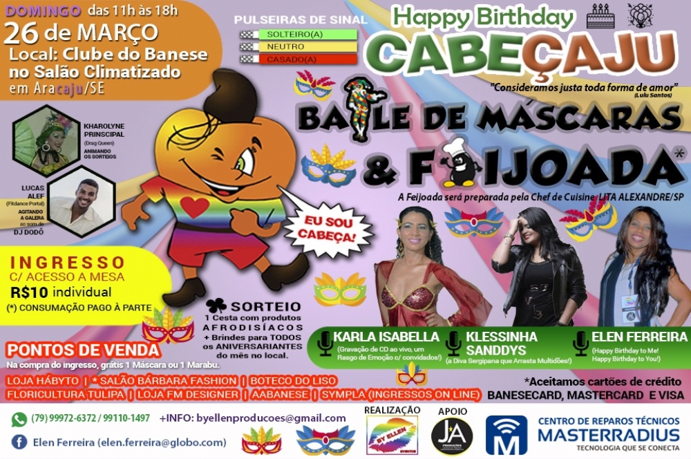 No domingo, dia 26 de março, das 11h às 18h, Aracaju será palco do ‘Cabeçaju – Baile de Máscaras & Feijoada’. O evento pretende comemorar o aniversário da cidade e da promoter Elen Ferreira, além de homenagear todas aquelas pessoas nascidas nesse mês.