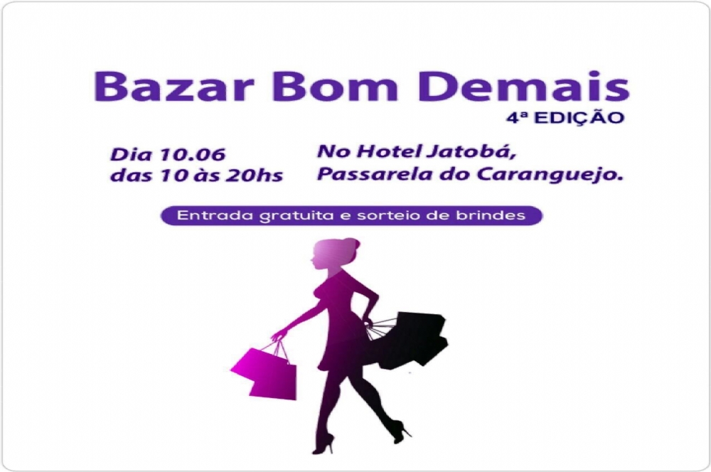 A 4ª edição do Bazar Bom Demais será no dia 10/06 no Hotel Jatobá (na passarela do caranguejo). Uma maravilhosa oportunidade para garantir as novidades que as lojas prepararam para o São João e Dia dos Namorados. Roupas e acessórios feminino, masculino e infantil, maquiagem, moda fitness, praia, lingerie, maquiagem, eletrônicos e muito mais.