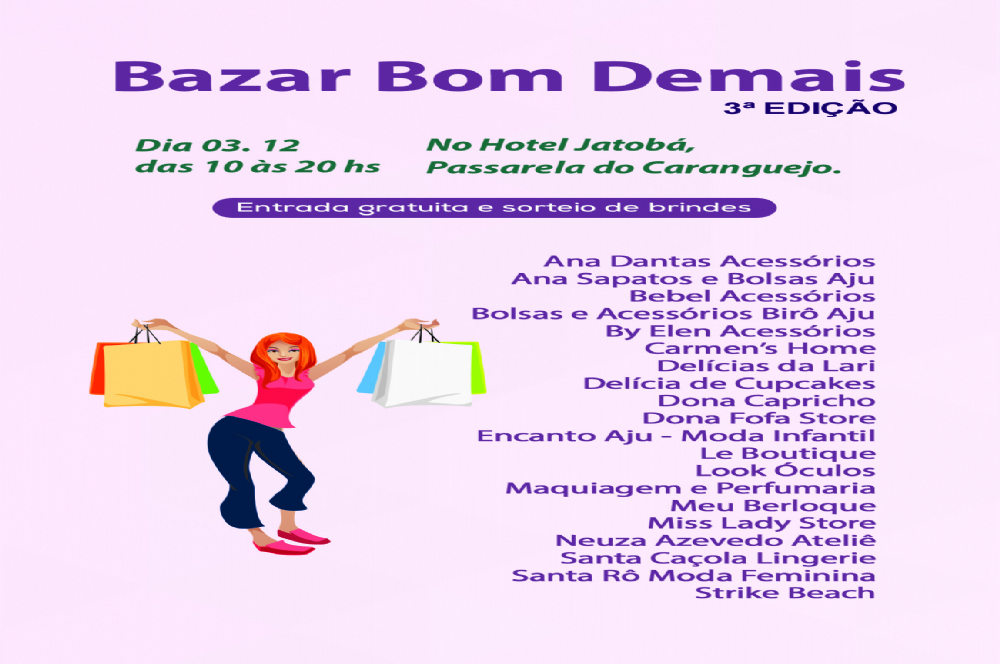 Acontece nesse sábado, 03/12, a 3ª edição do Bazar Bom Demais. Ótima oportunidade para adquirir itens com preço bacana para as festas e confraternizações de final de ano. Das 10h às 20h, no Hotel Jatobá, na Passarela do Caranguejo. Não fiquem de fora! Entrada gratuita e sorteio de brindes.