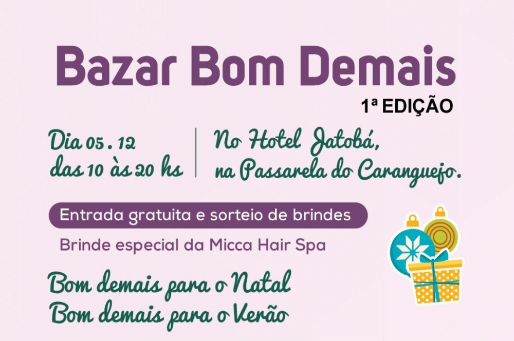 A 1ª edição do Bazar Bom Demais acontece no dia 5 de dezembro, das 10h às 20h, no Hotel Jatobá, na Orla da Atalaia. O evento contará com expositores de diversos segmentos, entre eles, moda fitness, moda feminina, bijuterias, acessórios, artesanatos, óculos, cupcakes, lingeries, biquínis, moda kids, acessórios para animais e tshirts. A entrada é gratuita e o evento ainda contará com sorteio de brindes.