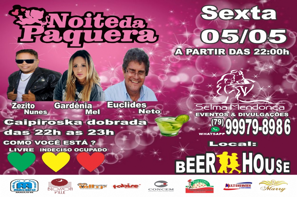 A Casa de Show Beer House recebe no dia 5 de maio, a partir das 22h, a "Noite da Paquera". O evento contará com shows de Zezito Nunes, Gardênia Mel e Euclides Neto, além de sorteio de brindes e dançarino à disposição das damas. A entrada individual custa R$ 25. A Casa de Shows e Restaurante Beer House situa-se na Orla de Atalaia, próximo ao Oceanário. Informações por meio do telefone (79) 99979-8986.