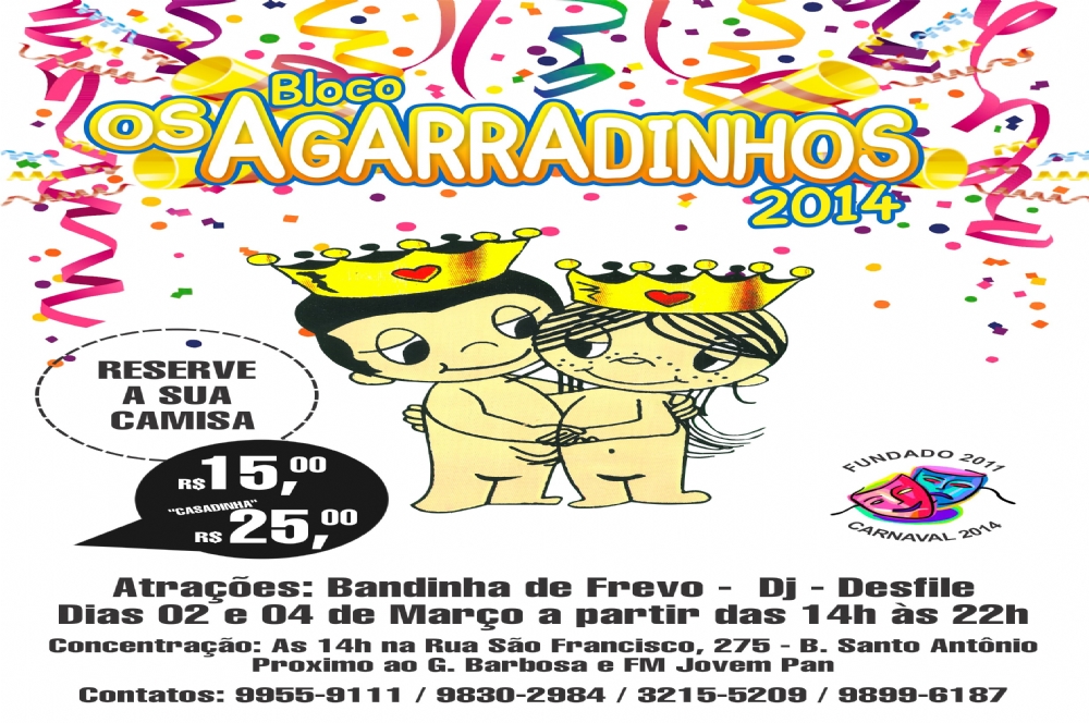 O Bloco Os Agarradinhos desfilará nos dias 2 e 4 de março, das 14h às 22h, no bairro Santo Antônio. A concentração será na rua São Francisco, nº 275, próximo ao GBarbosa e à Rádio Jovem Pan.