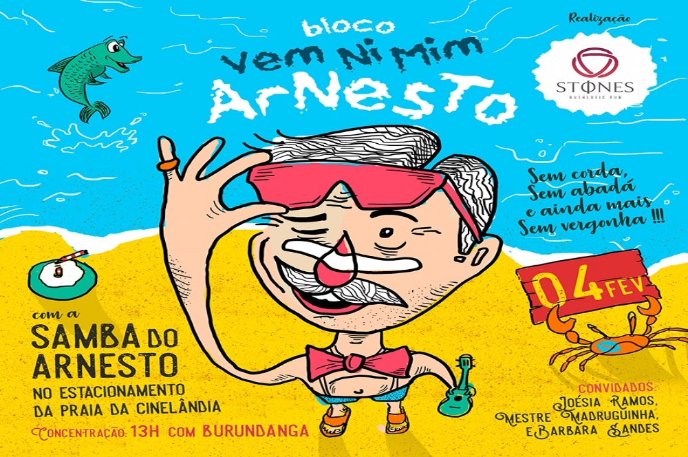No domingo, 4 de fevereiro, a partir das 13h, no Estacionamento da Cinelandia, Orla de Atalaia, acontecerá a primeira edição do bloquinho de rua 'VEM NI MIM ARNESTO'. O bloco traz o lema: "sem corda, sem abadá e sem vergonha!"