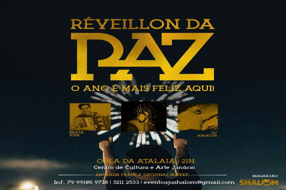 A banda Brasa Viva e o Dj Angelus são as atrações do Réveillon da Paz. No dia 31, a partir das 21h, a festa acontece no Centro de Cultura e Arte J. Inácio, localizado na Orla de Atalaia. A entrada é franca, mas também existe a opção de adquirir o buffet. Informações através dos telefones (79) 99105 9728/ 3211 2533 e do e-mail eventoajushalom@gmail.com.