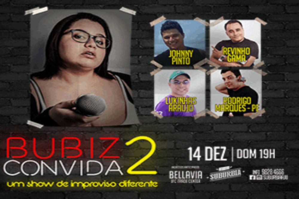 O espetáculo será realizado neste domingo, 14, a partir das 19h no Subúrbia. Esta é a segunda edição do Bubiz Convida, projeto idealizado pela humorista em parceria com a Vilela Produções, estreado com sucesso no mês de fevereiro. Os ingressos estão sendo vendidos antecipadamente na loja Bella Via (JFC Trade Center) ao valor de R$20.
