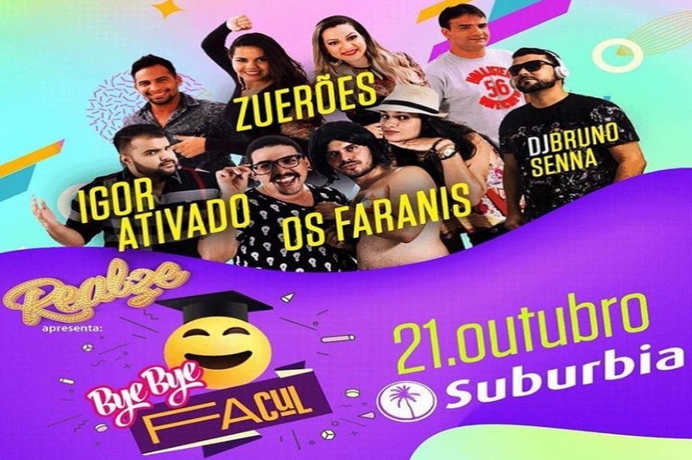 O sábado, 21 de outubro, no Suburbia vai ser pura animação. A casa recebe o evento “Bye Bye Facul” da Realize Formaturas com Zuerões, Igor Ativado, Os Faranis e o Dj Bruno Senna.