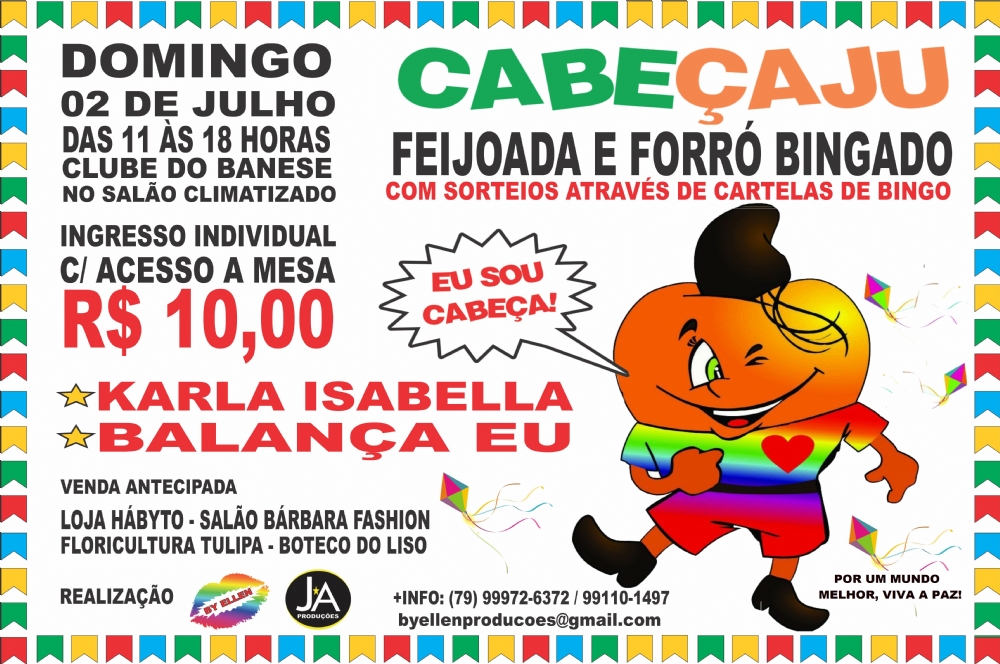 No domingo, dia 2 de julho, das 11h às 18h, Aracaju será palco do CABEÇAJU FEIJOADA & FORRÓ BINGADO, em comemoração ao aniversário do evento alternativo. Durante a festa, haverá diversos sorteios através de cartelas de bingo, daí surgiu o termo “forró bingado”. O local do evento será o salão climatizado do Clube do Banese, na Av. Mário Jorge Menezes Vieira, nº 1350, Bairro Coroa do Meio, em Aracaju/SE.