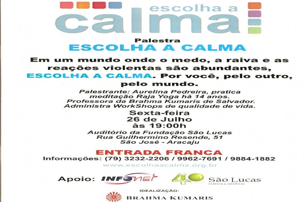 O lançamento da campanha “ESCOLHA A CALMA” em Aracaju acontecerá dia 26 de julho, com palestra pública com Lina Pedreira da Organização Brahma Kumaris de Salvador. O evento será às 19 h, no auditório da Fundação São Lucas, localizado na Rua Guilhermino Rezende, 51. Bairro São José. Informações pelos telefones (79) 32322206 / 99627691 / 98841882 e pelo Web site da campanha: http://www.escolhaacalma.net/