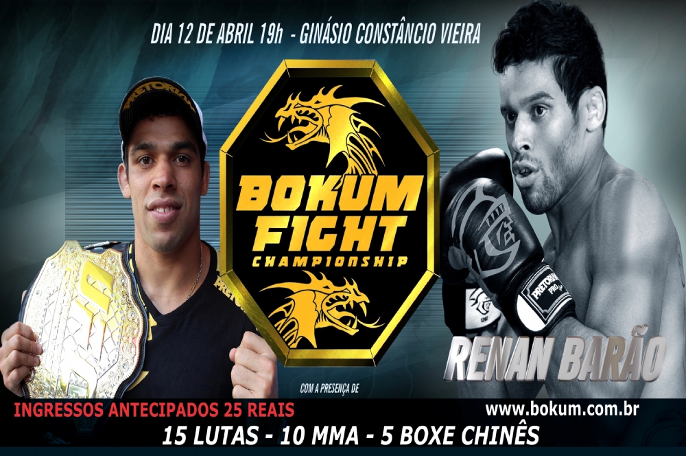 No dia 12 de abril, o Ginásio Constâncio Vieira recebe a partir das 19h, o Bokum Fight Championship. O evento, considerado um dos maiores de artes maciais do norte/nordeste, contará com dez lutas de MMA e cinco Boxe Chinês. Renan Barão participa do campeonato que envolverá a disputa de três cinturões.