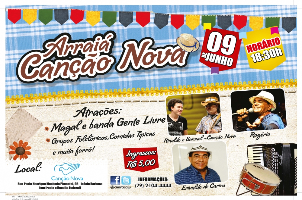 O mês de junho é o momento de se fazer homenagens aos três santos católicos: São João, São Pedro e Santo Antônio. E é pensando nesta alegria do povo nordestino e na evangelização, que a Canção Nova promove todo ano o Arraiá da Canção Nova, que este ano será realizado no dia 9 de junho, às 18h30, no rincão Canção Nova (rua Paulo Henrique Machado Pimentel, 95, Inácio Barbosa – em frente a Receita Federal), e contará com as apresentações de Rinaldo e Samuel, Rogério, Magal e banda Gente Livre, Erivaldo de Carira e grupos folclóricos.
