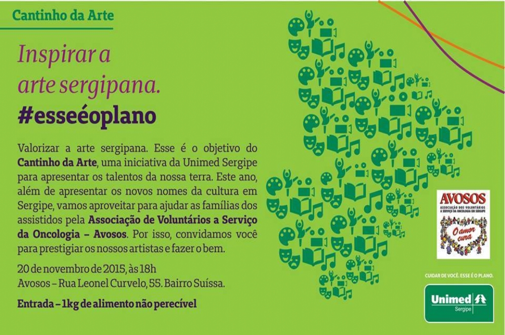 No dia 20 de novembro de 2015, às 18h, na sede da AVOSOS, Rua Leonel Curvelo, nº 55, bairro Suissa, a Unimed Sergipe promove a última edição do ano do Cantinho da Arte. Em um novo espaço cultural, a Cooperativa convida todos para participar do evento, que, além de apresentar os trabalhos dos artistas da terra à sociedade sergipana, arrecadará alimentos que serão doados às famílias dos assistidos pela Associação dos Voluntários a Serviço da Oncologia – AVOSOS.