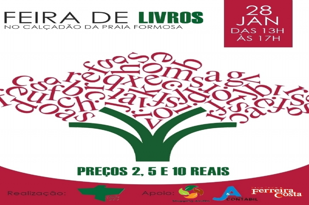 Nesse domingo, 28 de janeiro, o Instituto Canto Vivo vai realizar um Feira de Livros no Calçadão da Praia Formosa. Os valores simbólicos de R$ 2, R$ 5 e R$ 10 serão utilizados em projetos da ONG, como distribuição de sementes de árvores e educação ambiental, além do efetivo plantio urbano de mudas.O evento, que ocorre das 13h às 17h, tem apoio do Shopping Jardins, do Ferreira Costa e da J&A Contábil.