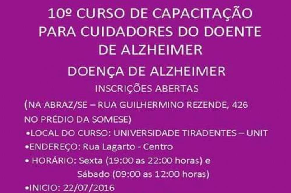 O curso é destinado a familiares, cuidadores e estudantes da área de saúde. As aulas serão realizadas no Campus Centro da Universidade Tiradentes (Unit), da Rua Lagarto. Informações através dos telefones 3042 2056 e 99975 8256.