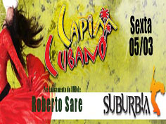 A Suburbia reabre suas portas em grande estilo. Nesta sexta-feira, 05, quem sobe ao palco é a super banda Capim Cubano agitando com suas salsas, merengues e as músicas mais calientes do momento, além de grandes sucessos que até hoje fazem a cabeça de todos, uma noite para esquentar corações com muita dança latina e corpos sensuais. Haverá ainda show com Roberto Sare.