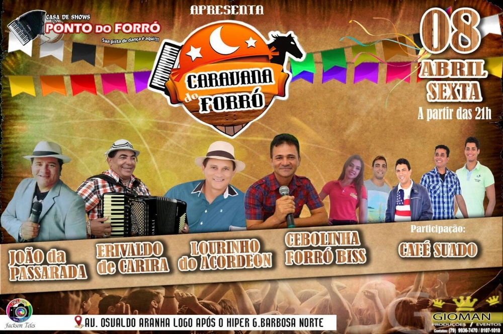 João da Passarada, Erivaldo de Carira, Lourinho do Acordeon, Cebolinha Forró Bis e Café Suado são as atrações da Caravana do Forró que acontece nesta sexta-feira, 8, a partir das 21h.