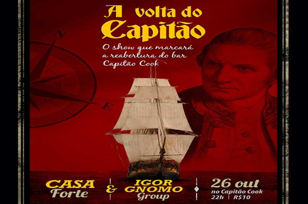 No dia 26/10, a partir das 22h, pela bagatela de apenas R$ 10, o Capitão Cook irá abrir suas portas para receber o povo sergipano ao som de muito rock, jazz, samba, forró, afrobeat e muito mais. As bandas Casa Forte e Igor Gnomo Group são as atrações.