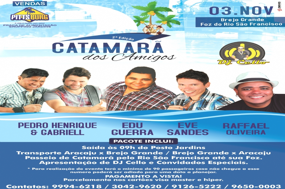 O Catamarã dos Amigos terá as seguintes atrações: Dj Cello, de Edu Guerra, Pedro Henrique & Gabriel, Eve Sandes, Rafael Oliveira e muito mais. A