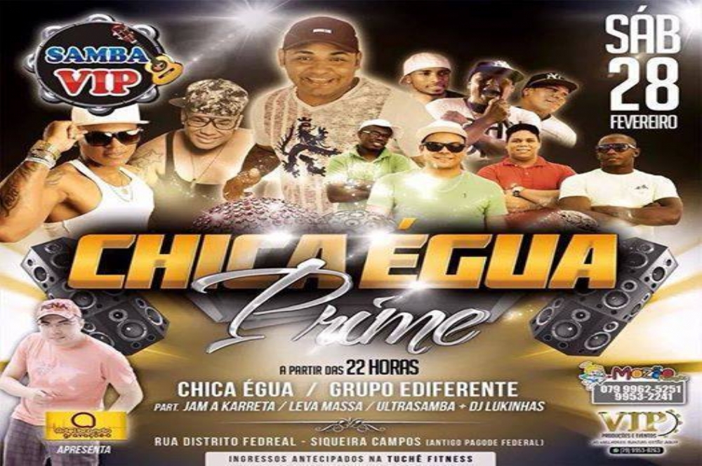 O grupo Chica Égua é a principal atração do Chica Égua prime que acontece neste sábado, 28, a partir das 22h, no Samba Vip. A festa conta ainda com apresentação do grupo ÉDiferente e participação Jam – A Karreta, Leva Massa, Ultrasamba e Dj Lukinhas.